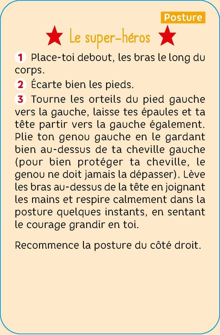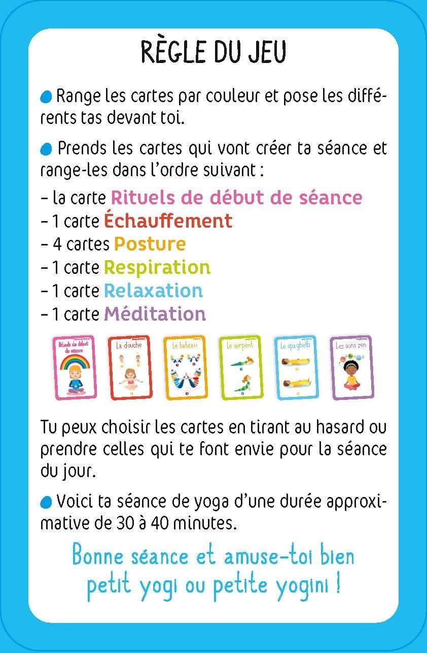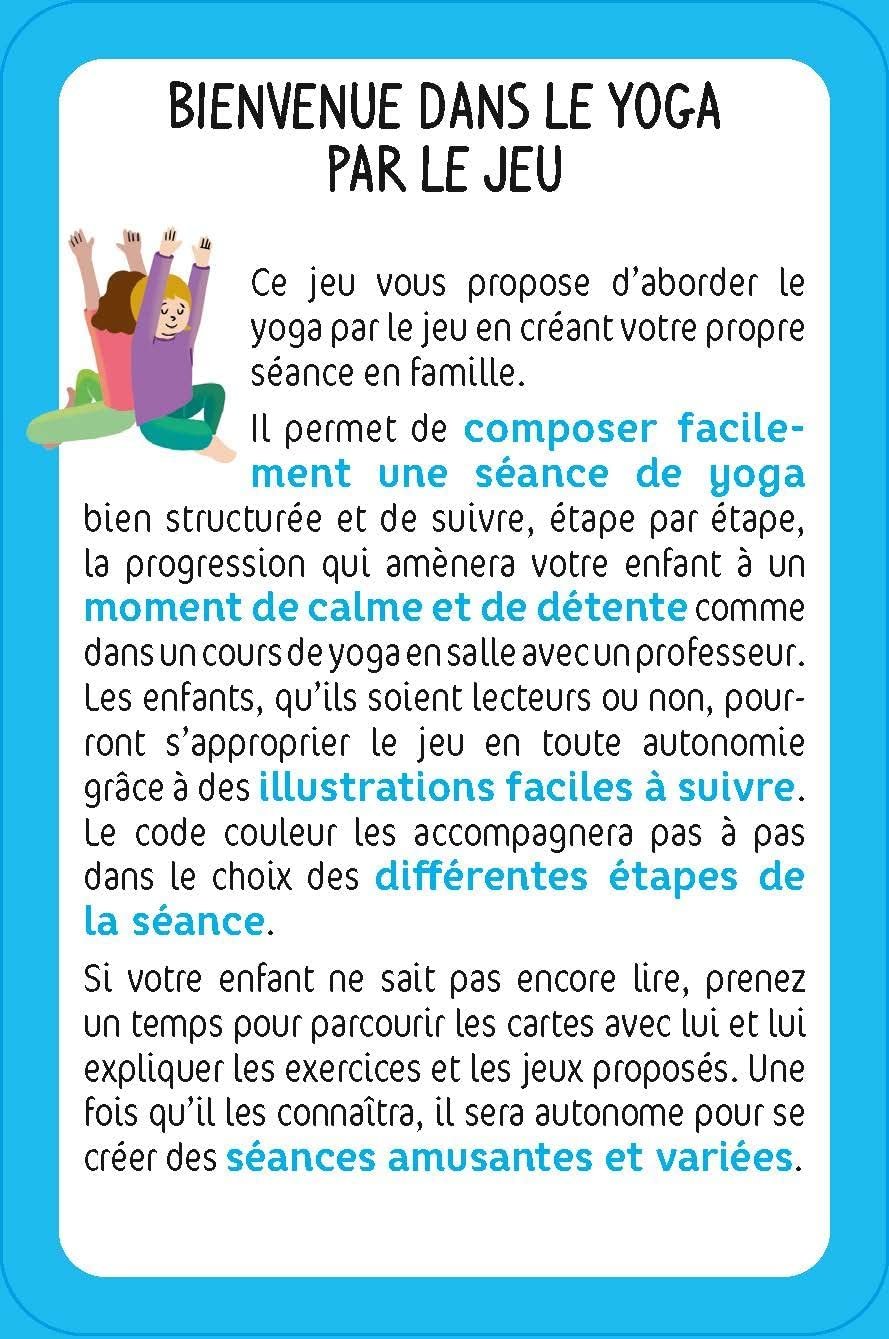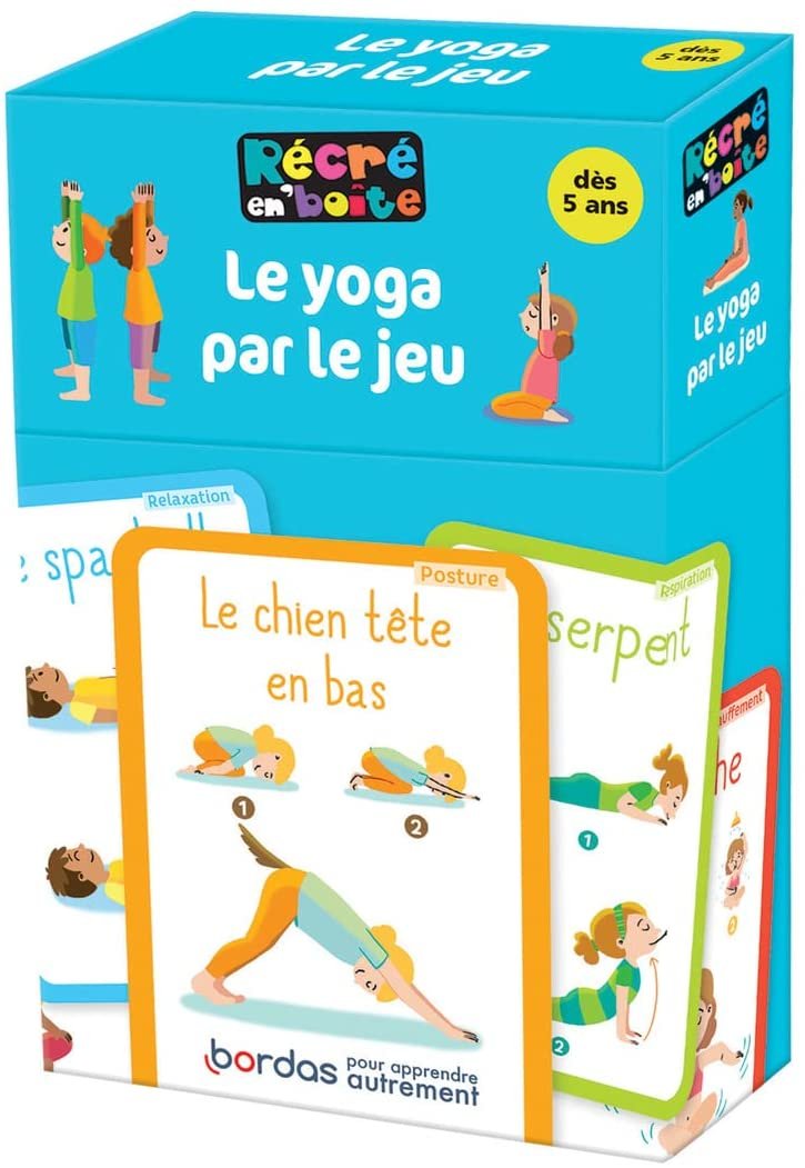 - Dans la collection “Récré en boîte”, Le yoga par le jeu est un jeu de cartes qui permet à l’enfant de créer ses propres séances de yoga. Les cartes sont réparties en six catégories : rituel de début de séance, échauffement, postures, exercice de respiration, exercice de relaxation et, enfin, un moment de méditation.