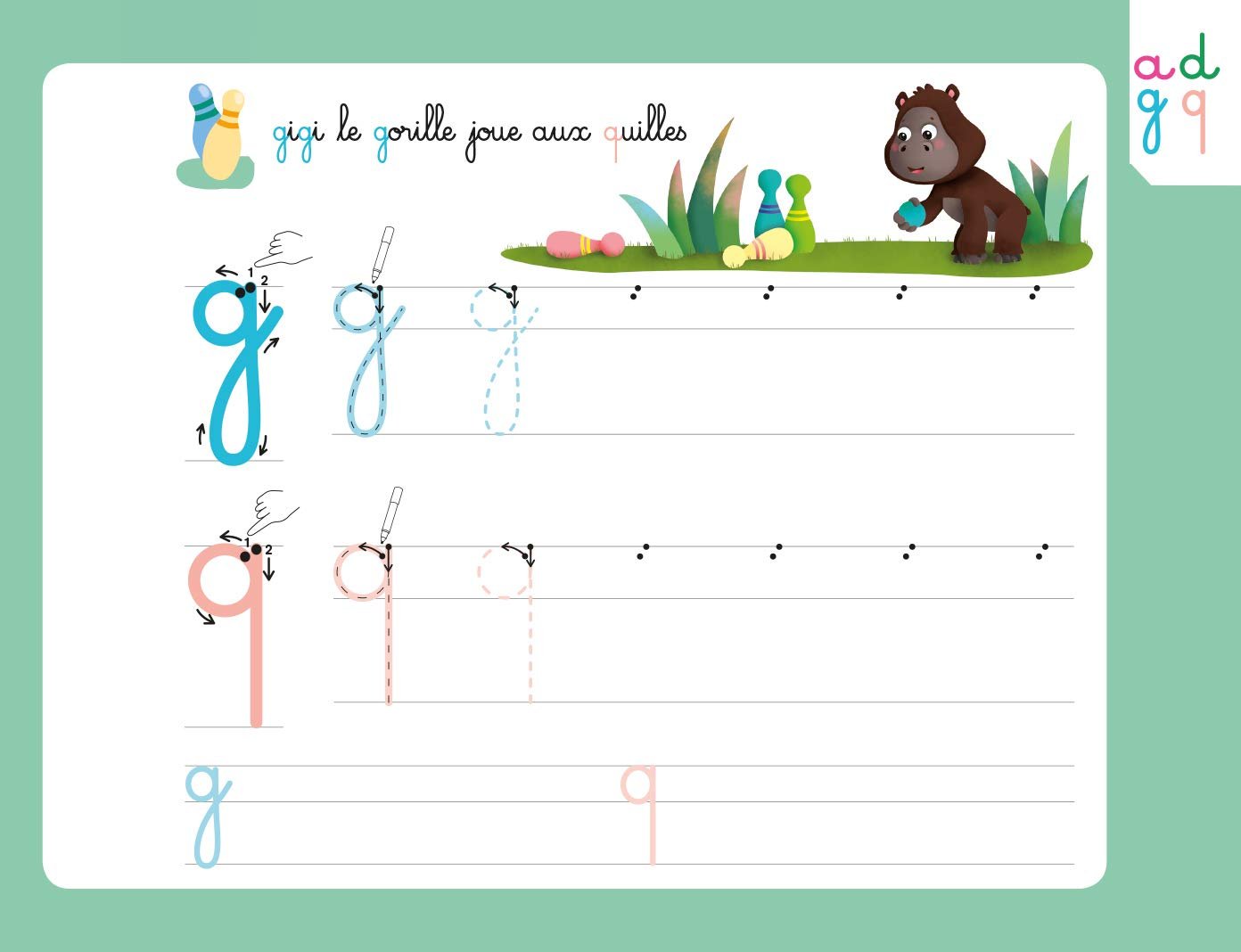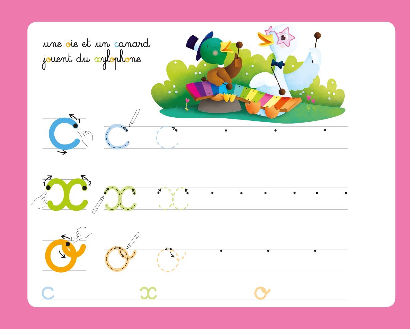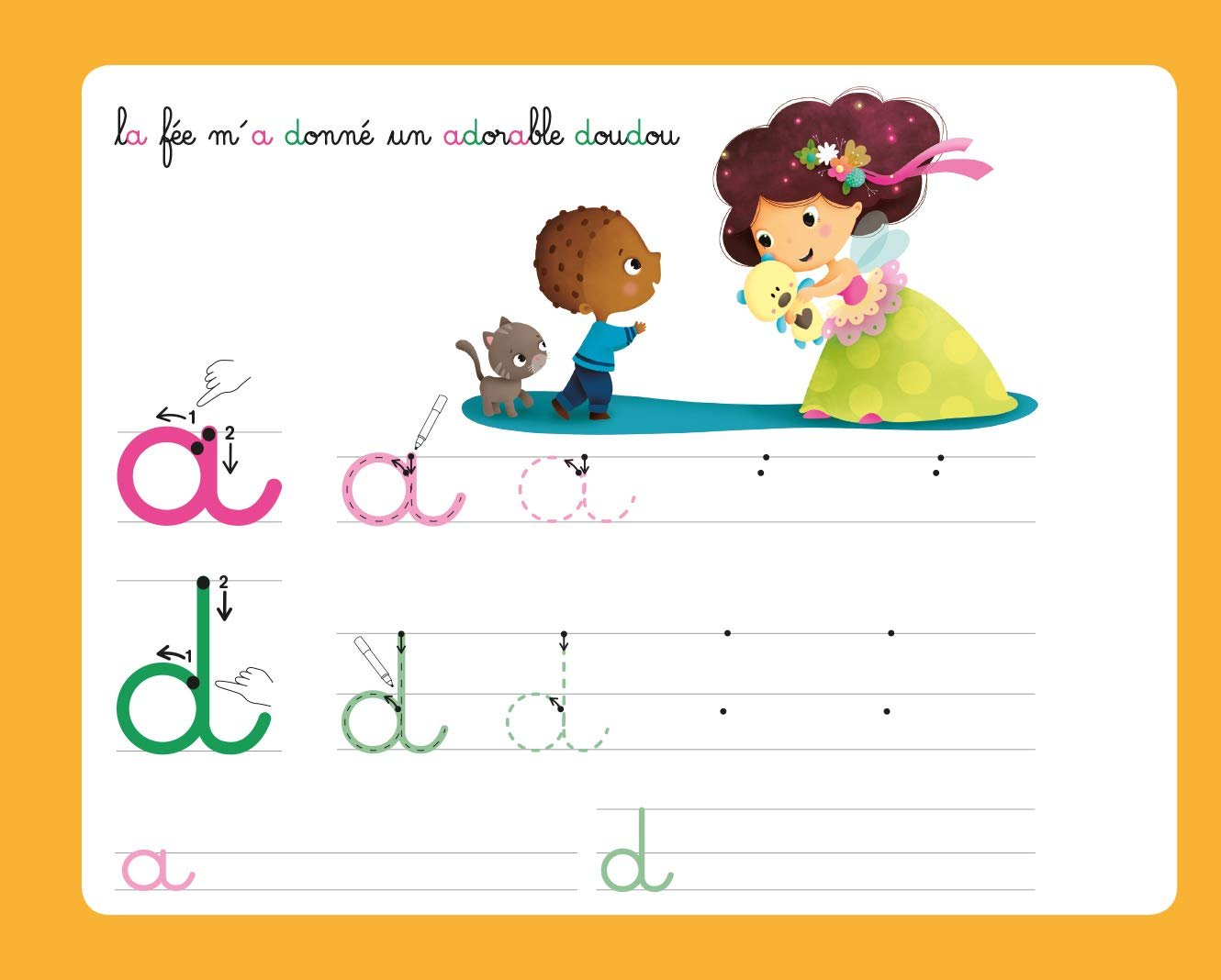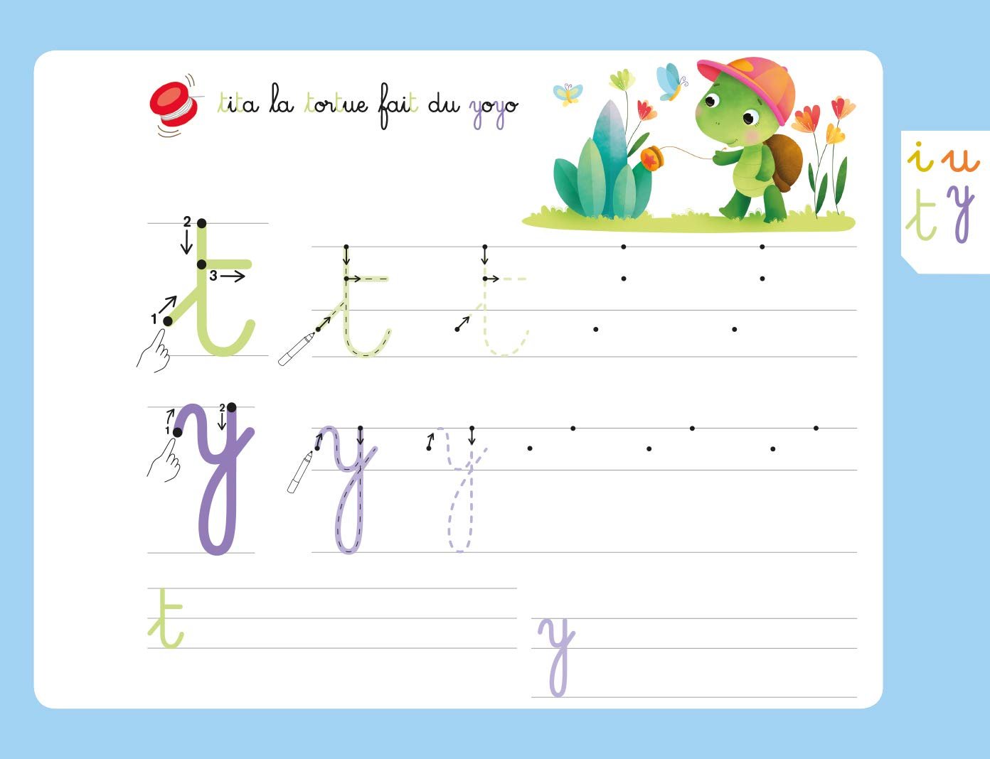 Pour mémoriser le geste, l’enfant trace le modèle de la lettre avec son doigt avant de l’écrire avec le feutre. Il peut recommencer autant de fois qu’il le souhaite grâce aux pages effaçables !