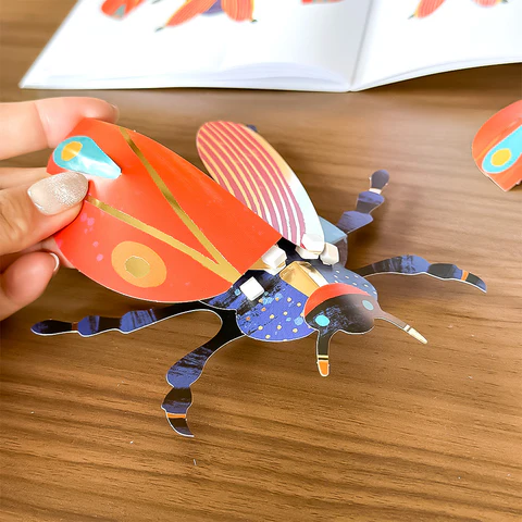 Create 4 magnificent, shimmery 3D bugs. Includes pre-cut paper and cardboard to fold and assemble. All of the materials needed are provided, including: glue, double-sided tape and stickers. They’ll be so proud to have made these bugs with their own hands! All that’s left to do is hang them up.