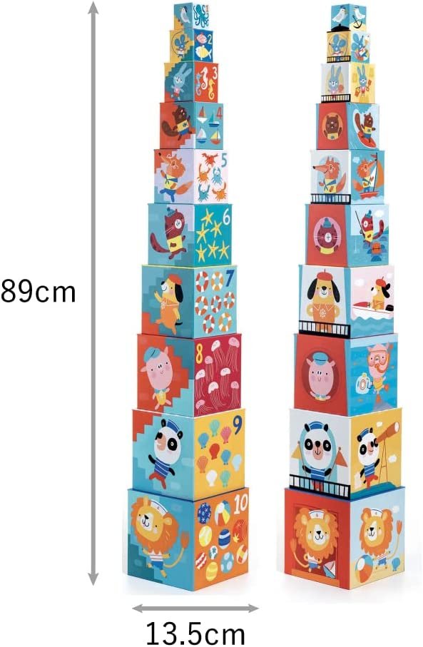 - Towers stack to 38 inches high, comes complete with a convenient carrying handle, an excellent gift for toddlers 12 months +