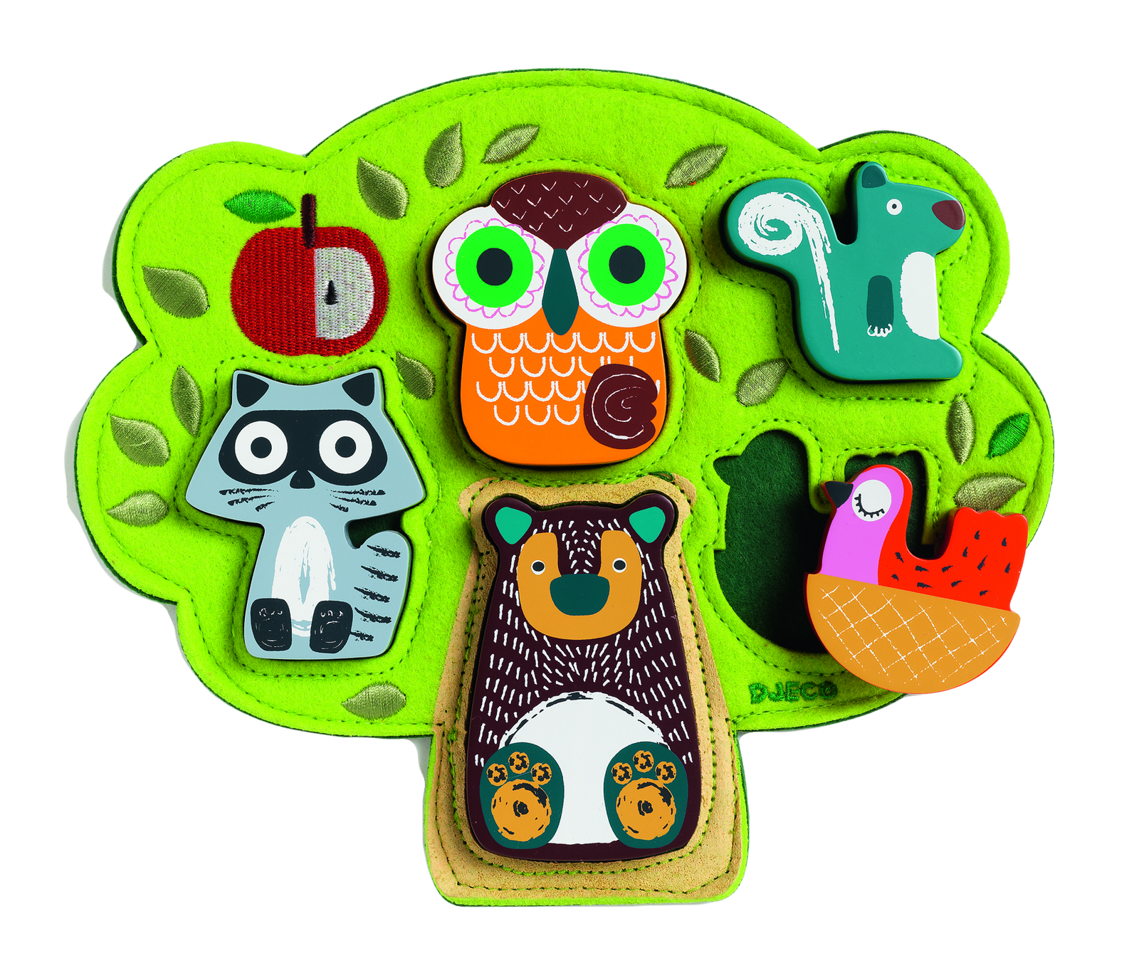 - The wooden puzzle Oskiis a beautiful relief puzzle in felt with 5 wooden lift-out animals by Djeco.