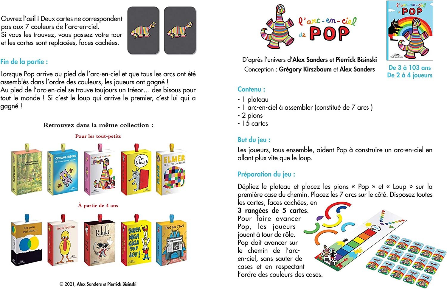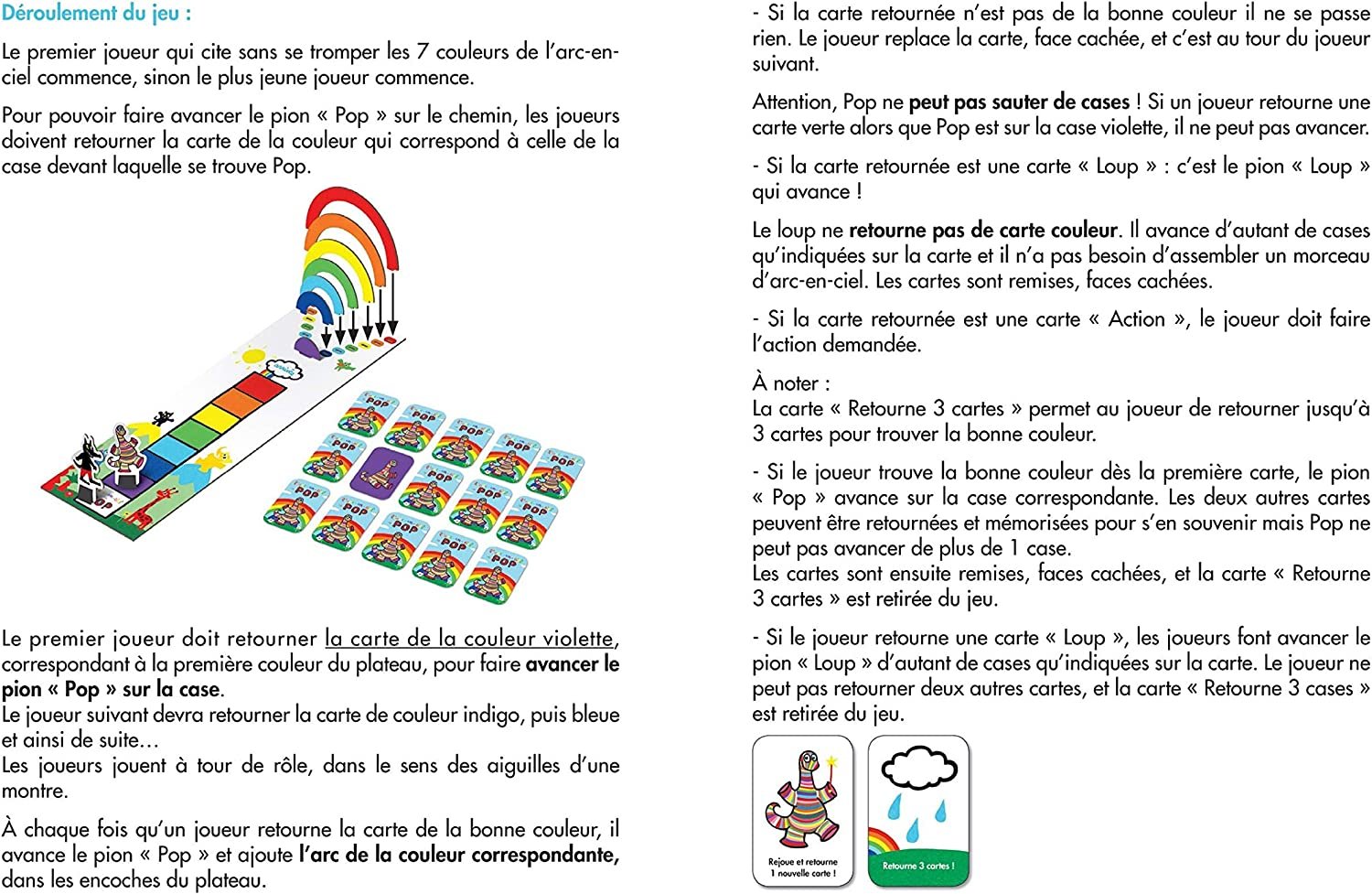 Dépliez le plateau et posez les 15 cartes faces cachées. Disposez les 2 pions sur le case départ. Pop doit avancer sur le chemin de l’arc-en-ciel en 7 anneaux en respectant l’ordre des couleurs des cases. À tour de rôle, les joueurs retournent une carte. Pour faire avancer Pop, il faut que la couleur corresponde à la case sur laquelle Pop se trouve. Lorsque Pop arrive au pied de l’arc-en-ciel et que tous les morceaux d’arcs ont bien été assemblés, les joueurs ont gagné ! Si c’est le loup qui arrive le premier, c’est lui qui a gagné. Attention aux cartes spéciales qui vont venir chambouler la partie…