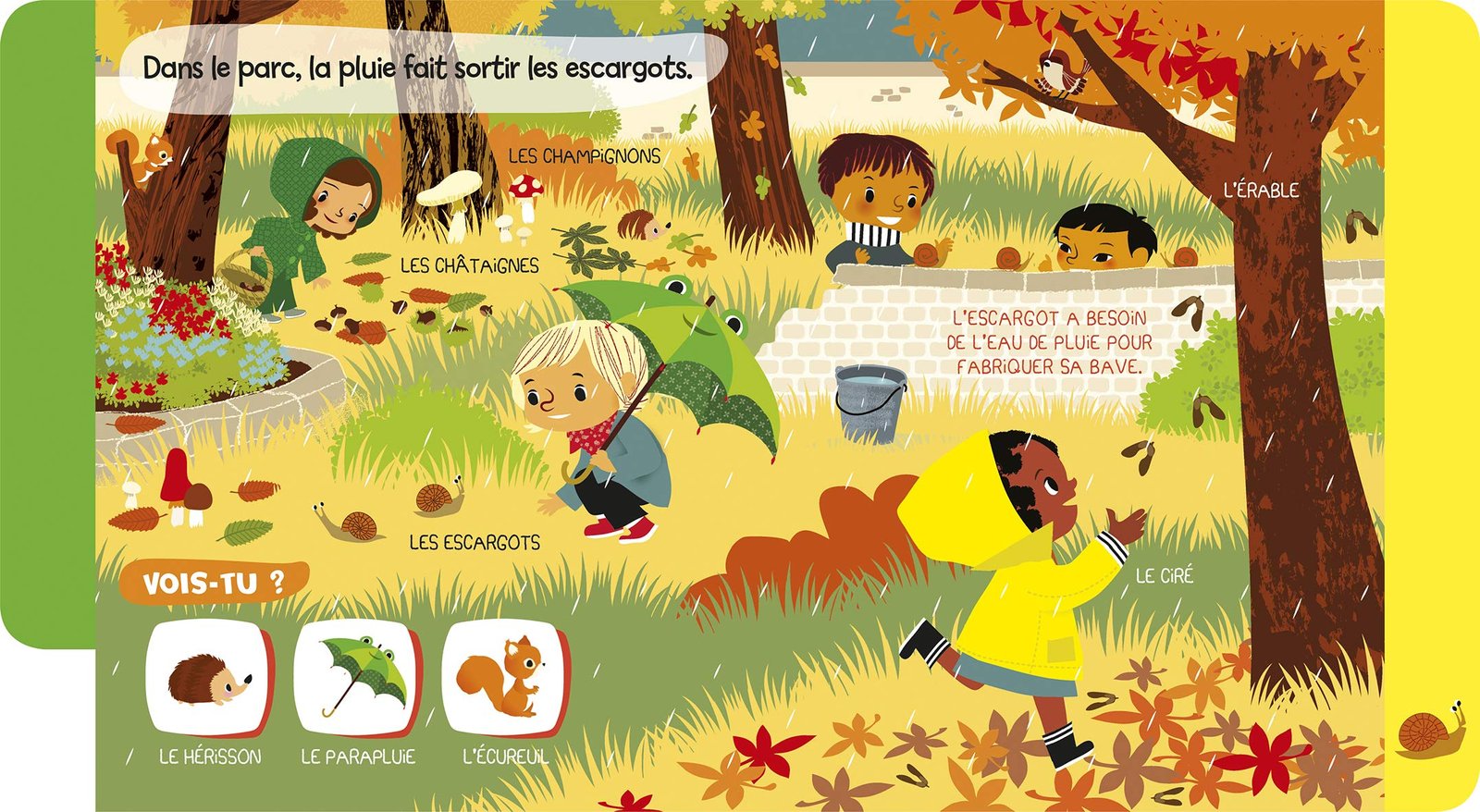 Sur chaque puce, l’enfant écoute le son suivi de sa description : les grenouilles qui coassent, les enfants qui jouent dans les flaques, le tonnerre qui gronde, le vent qui souffle, la pluie qui tombe et la chouette qui hulule.