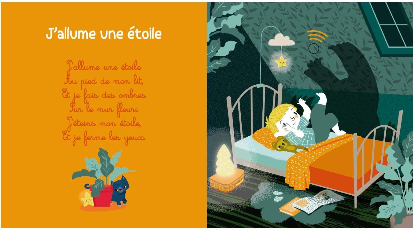 Au moment du coucher, on découvrira ” Dodo mamour ” ; ” La berceuse de Brahms ” ; ” La ronde de nuit ” ; ” J’allume une étoile ” ; ” Toutouig ” et un grand classique en anglais, ” Twinkle, twinkle little star “.
