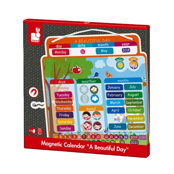 From 3 to 6 years-old. For children and parents who want to understand and manage time! Consisting of a hanging board and 67 magnets to indicate the date (day / month / year), the weather and current mood, every day, all year round! This agenda will accompany your child for 4 years and is ideal for teaching time-related concepts while fostering independence.