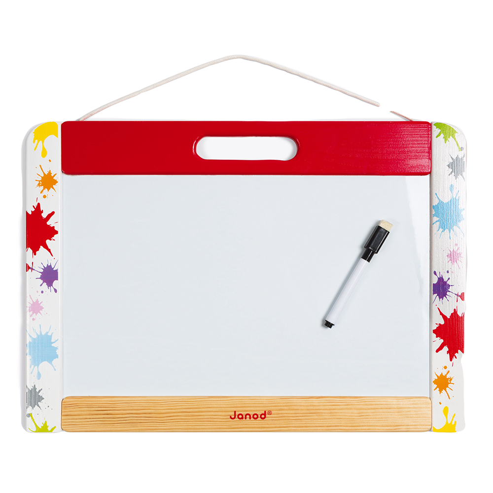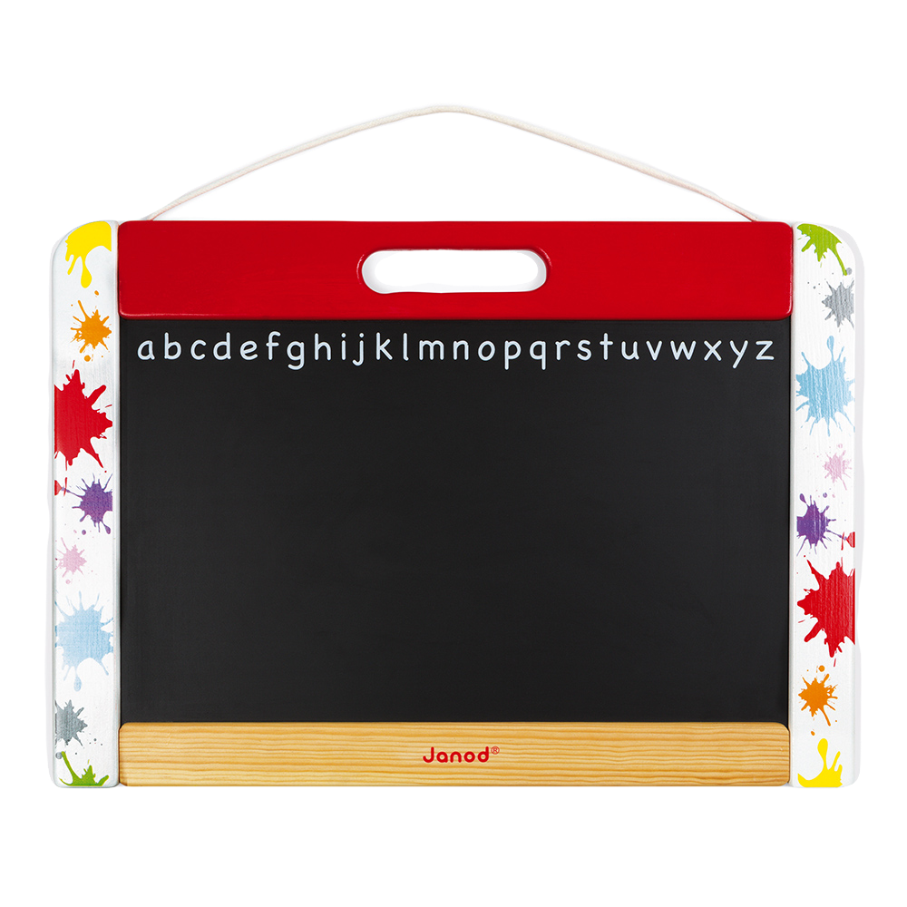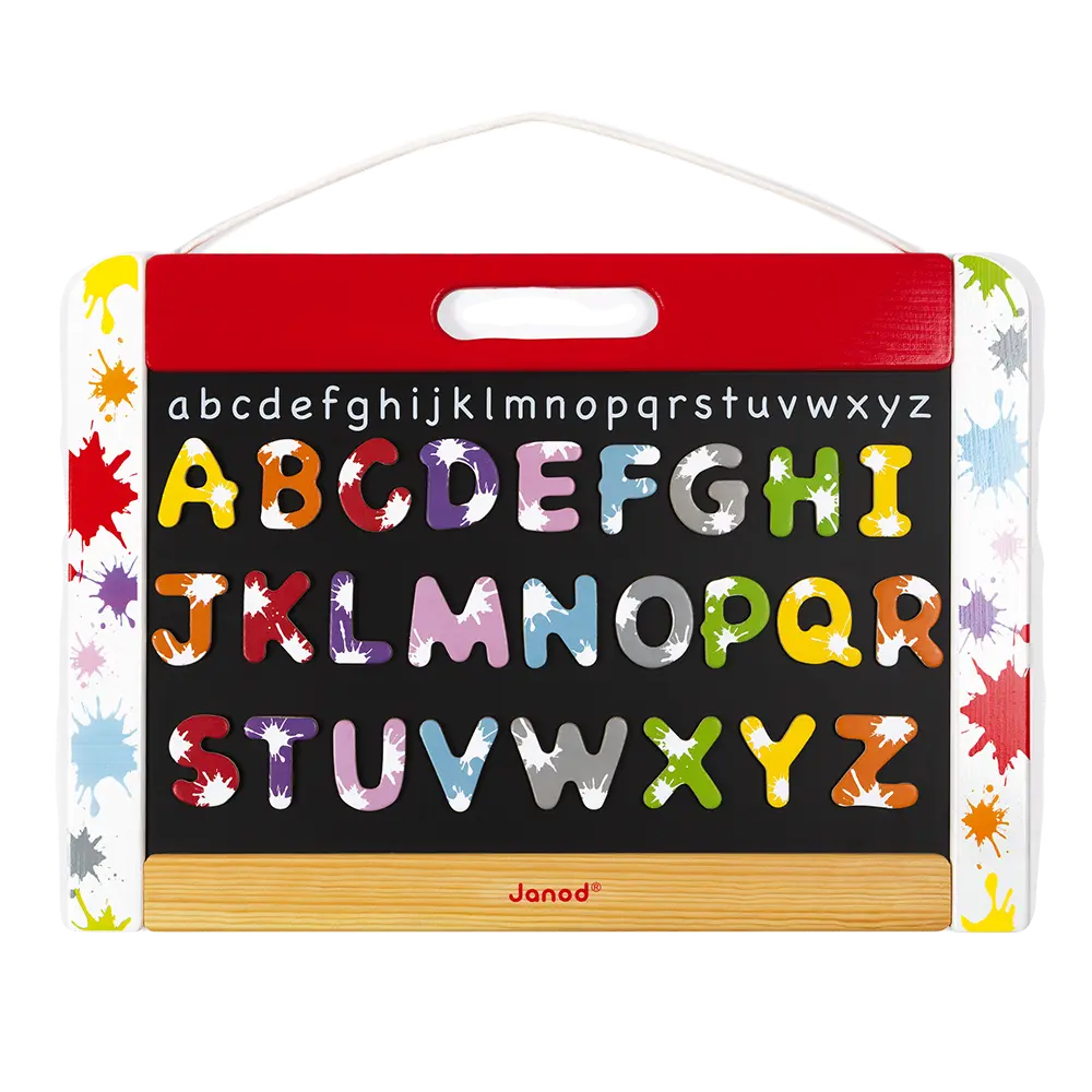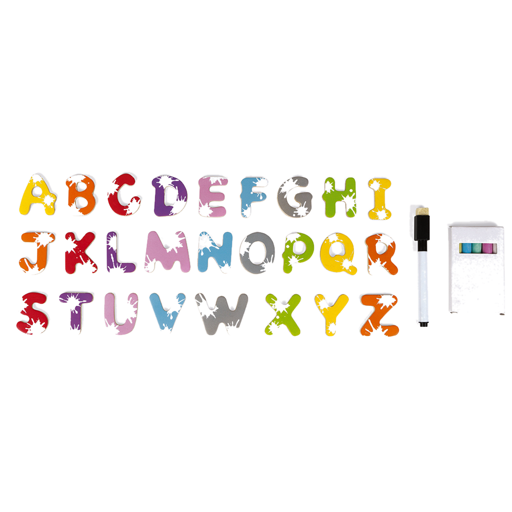 Magnetic writing board to hang on the wall. 1 writing board side to write with the chalk and 1 white side to write with the erasable marker. The board is magnetic on both sides, and includes 26 wooden letters, 1 box of 5 chalks and one marker with a brush cap. Wood : board frame (pinewood), black writing board (MDF), letters (plywood). Cotton string.